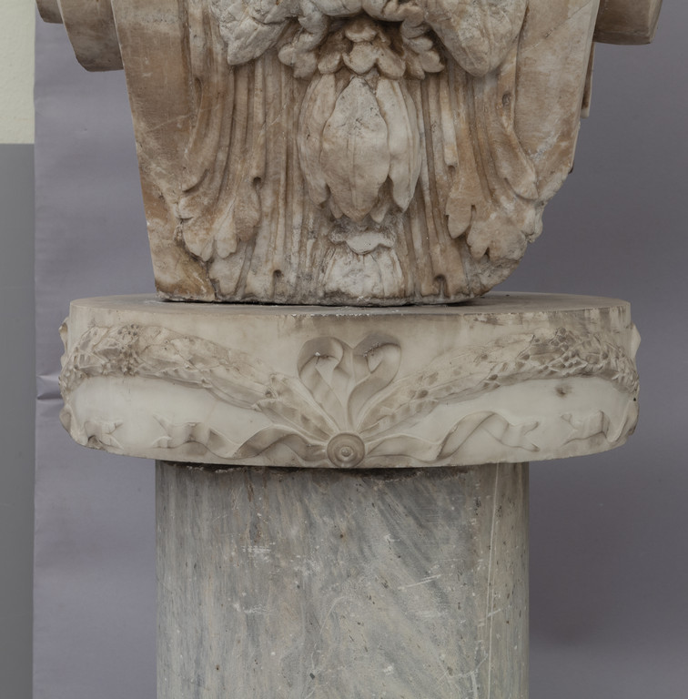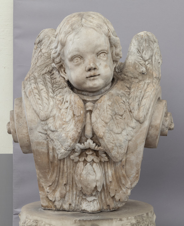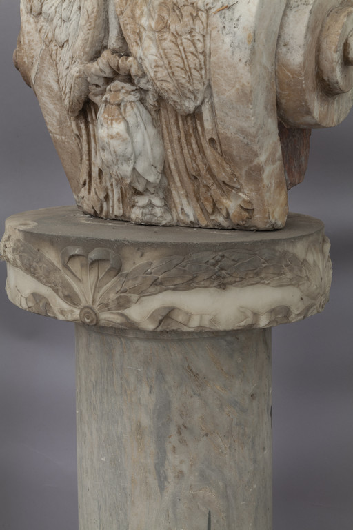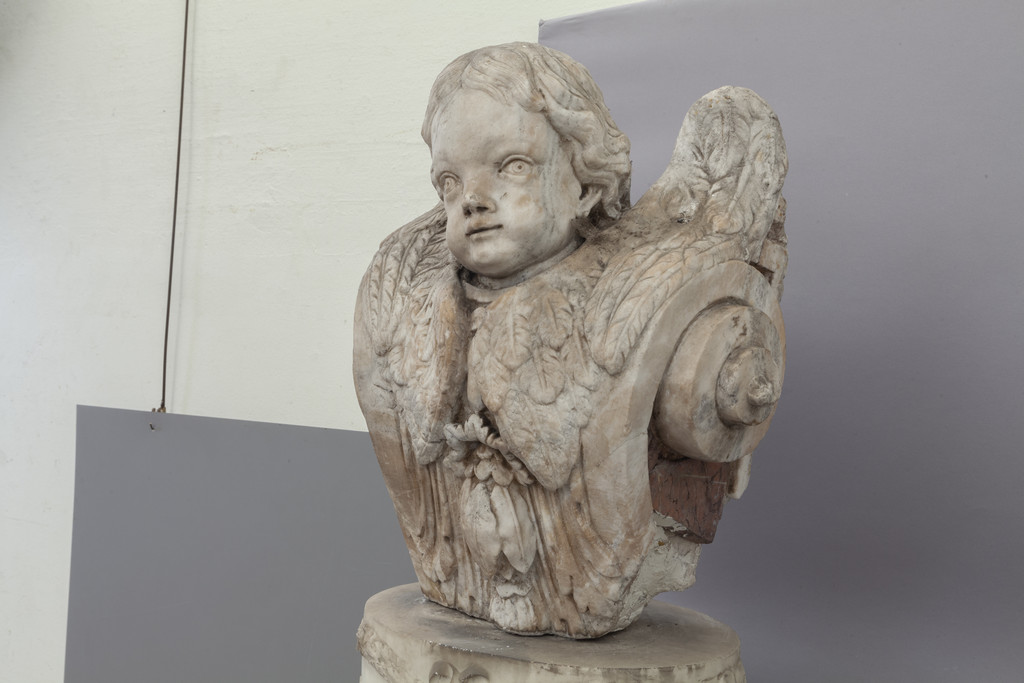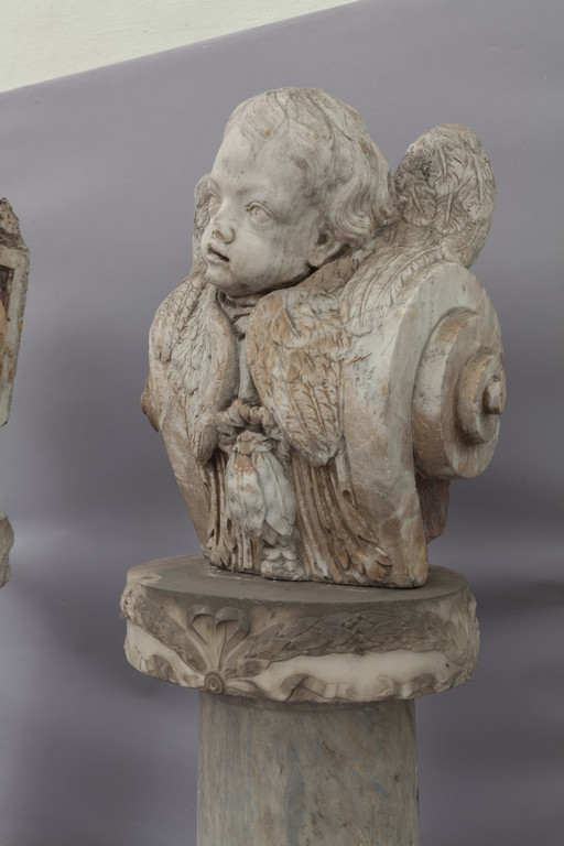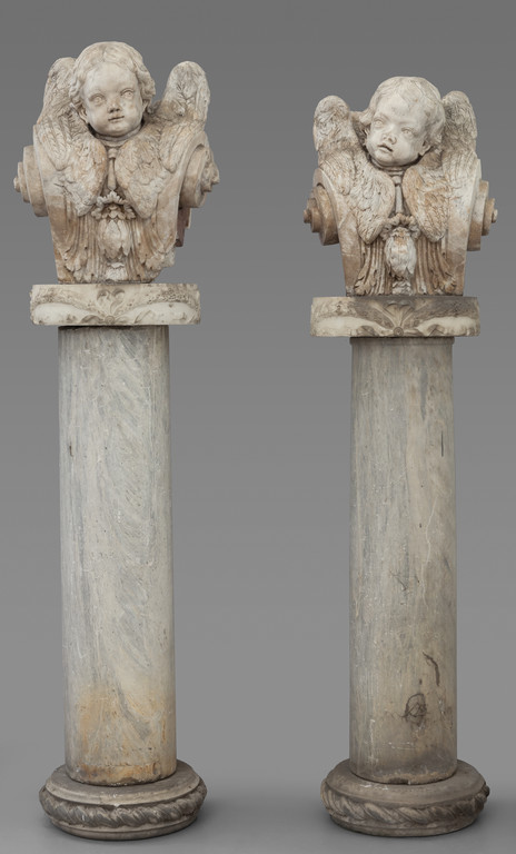 Coppia di elementi architettonici raffiguranti angeli alati in marmo bianco (cm.38xh.48) inizi sec.XVII poggianti su colonne in marmo bianco del sec.XIX (h.cm.120)