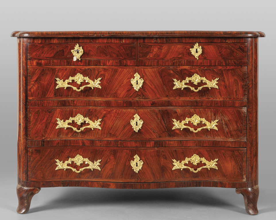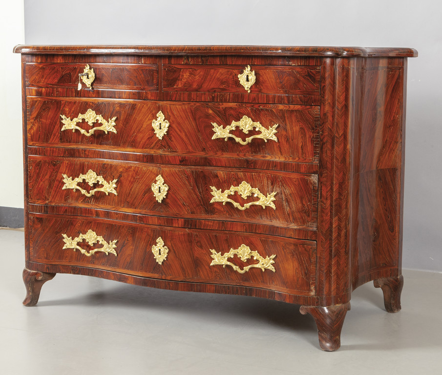Comò Luigi XIV intarsiato in bois de rose mosso sul fronte e sui fianchi tre cassetti più due Piemonte inizi sec.XVIII