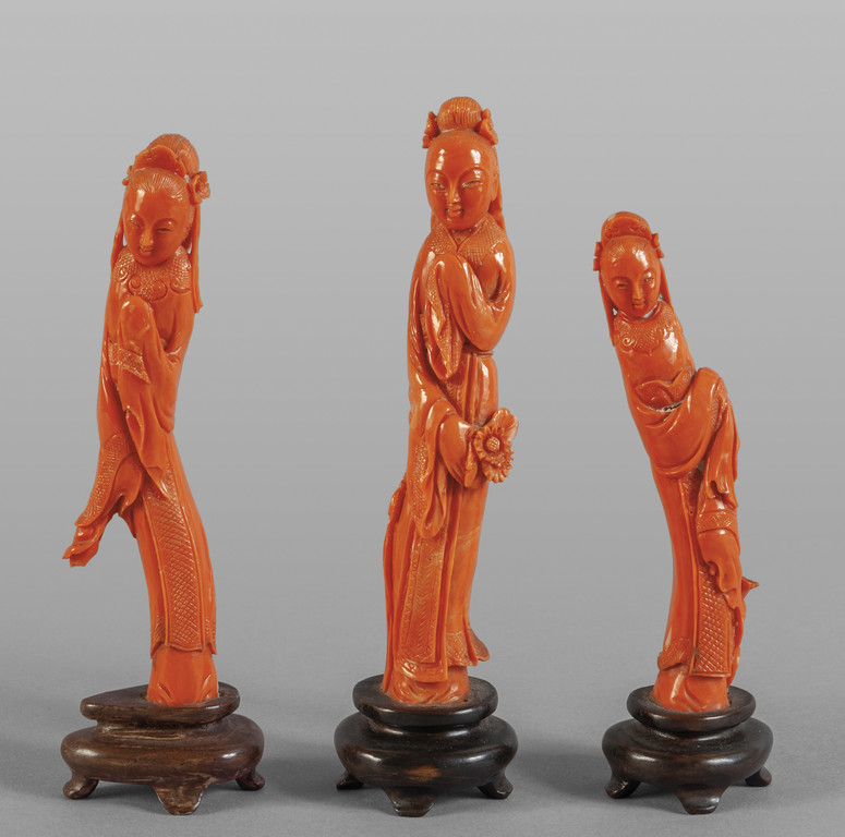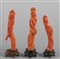Tre statuine in corallo rosso raffiguranti divinità orientali Cina inizi sec.XX peso con basi gr.230