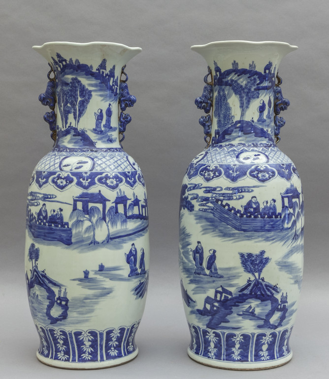 Coppia di vasi in porcellana decorazione bianca e blu con personaggi Cina fine sec.XIX