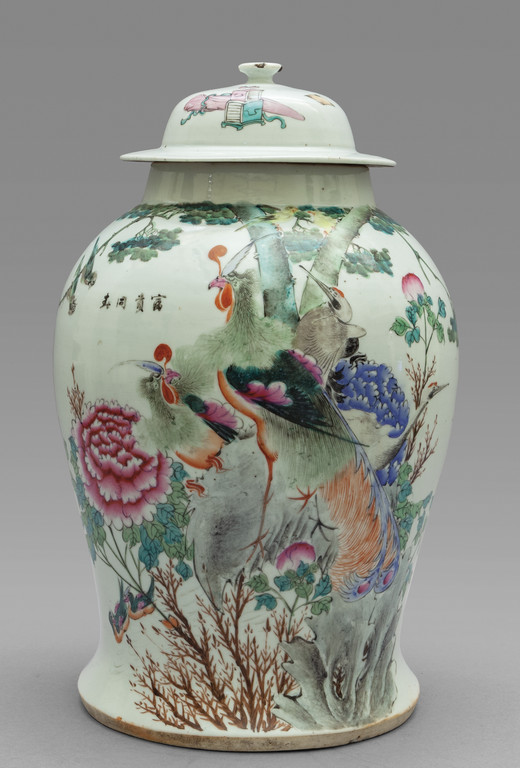 Potiche in porcellana di Cina bianca decorata in policromia con fiori e uccelli sec.XIX