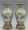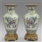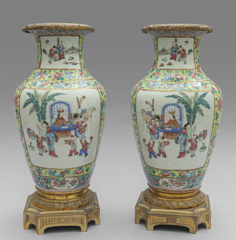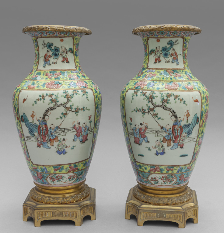 Coppia di vasi Famiglia Rosa in porcellan di Cina policorma decorati con scene di vita di corte montati in bronzo dorato sec.XIX