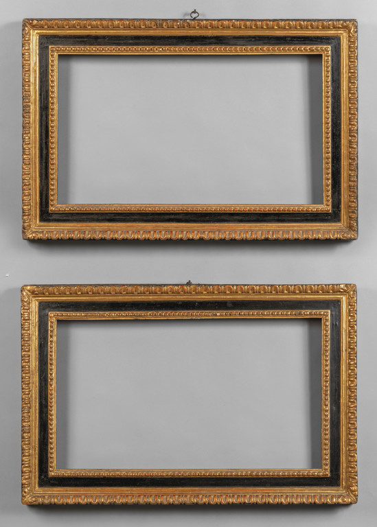 Coppia di cornici in legno intagliato e laccato nero ed oro Centro Italia sec.XVIII