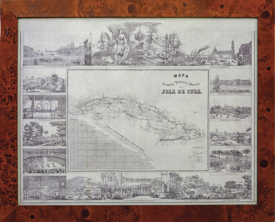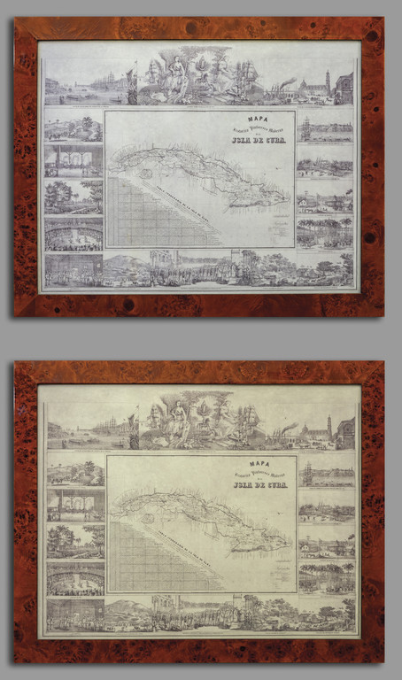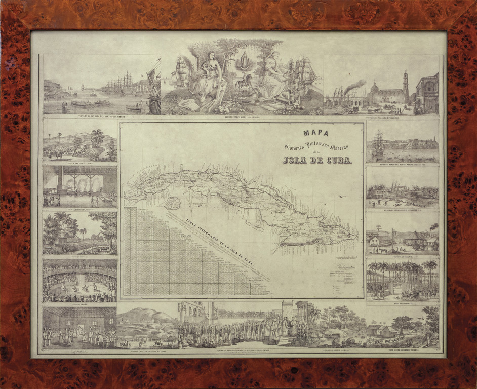 Coppia di cornici in radica con all'interno la mappa istorica pittoresca della Isla de Cuba (una originale e una fotocopiata)