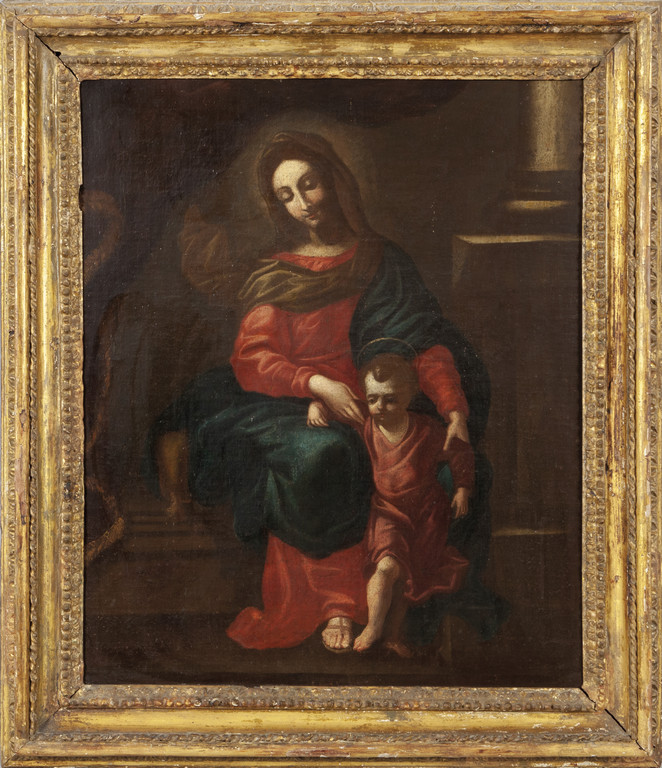 Scuola napoletana sec.XVII 'Madonna con Bambino' olio cornice coeva in legno intagliato e dorato