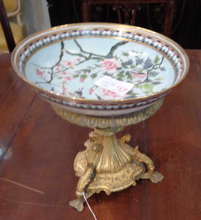 Alzata in metallo dorato con piatto in porcellana (rotto)