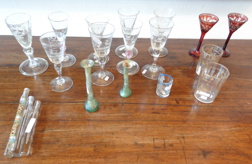 Tredici bicchieri diversi tre portaprofumo e due piccoli vasi a tromba in vetro verde