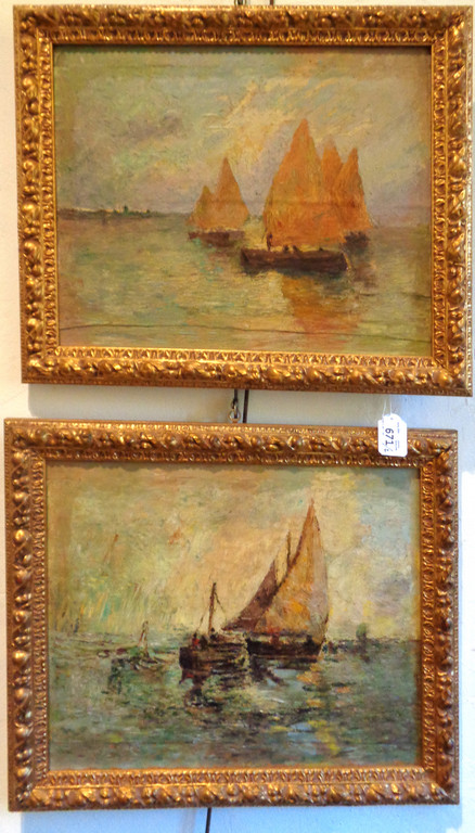 Scuola italiana sec.XX 'Paesaggi con velieri' coppia di olii