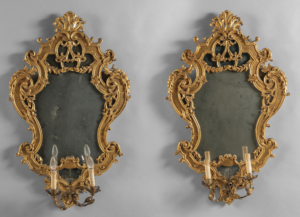 Coppia di apliques in stile Luigi XIV in legno intagliato e dorato sec.XIX