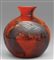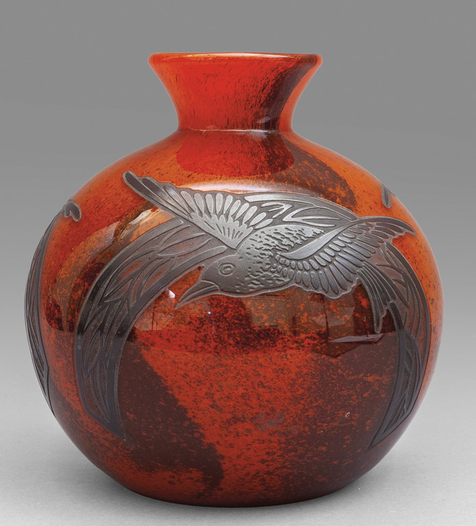 Vaso sferico in vetro rosso decorato con uccellini f.to Legras