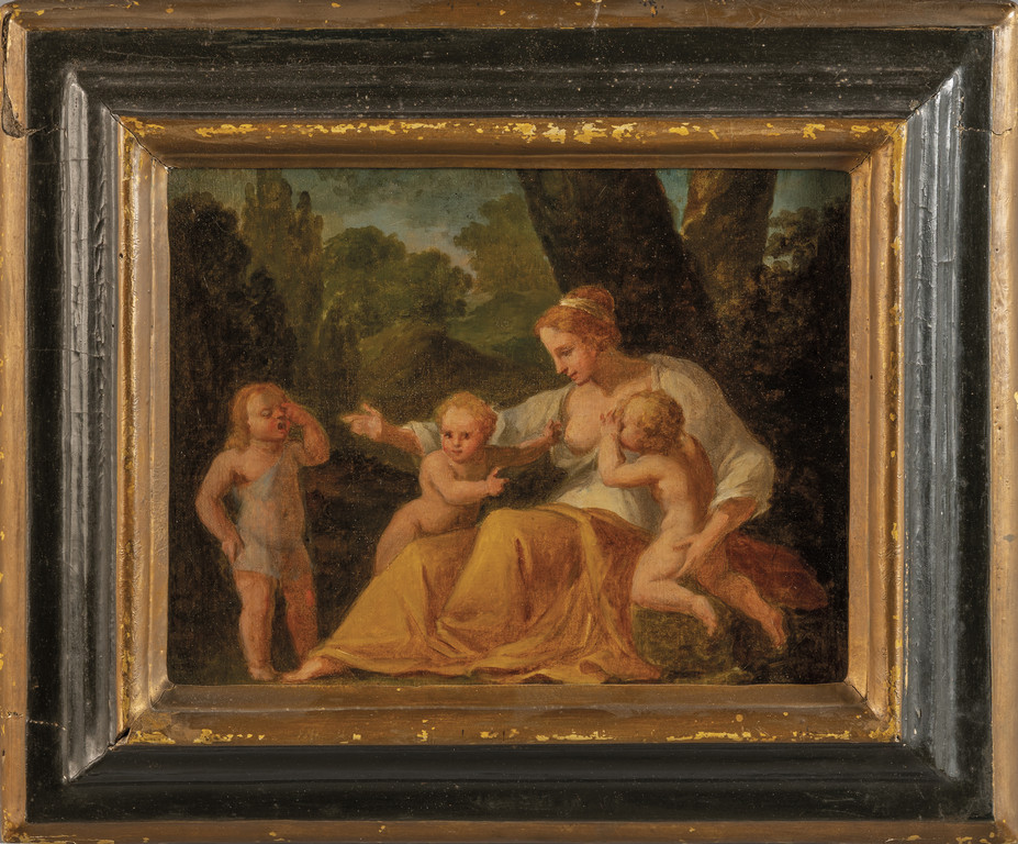 Scuola romana sec.XVIII 'Capricci di bimbi' olio cornice coeva in legno dorato ed ebanizzato