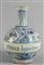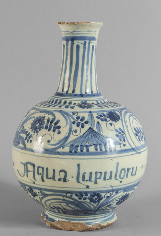 Bottiglia globulare in maiolica bianca e blu decoro calligrafico Acqua Lupuloro Savona sec.XVII sul fondo cartiglio mostra retrospettiva della ceramica ligure 1980