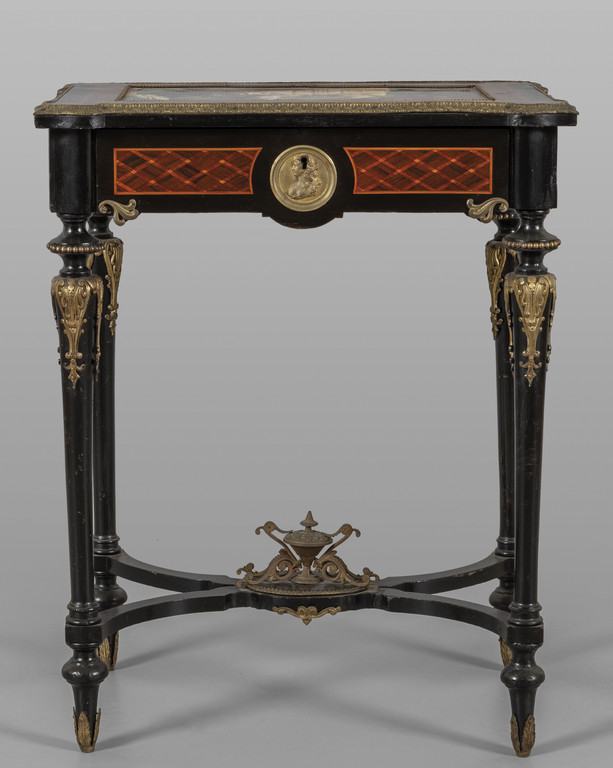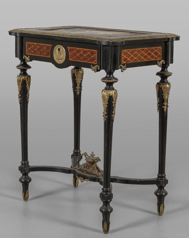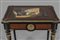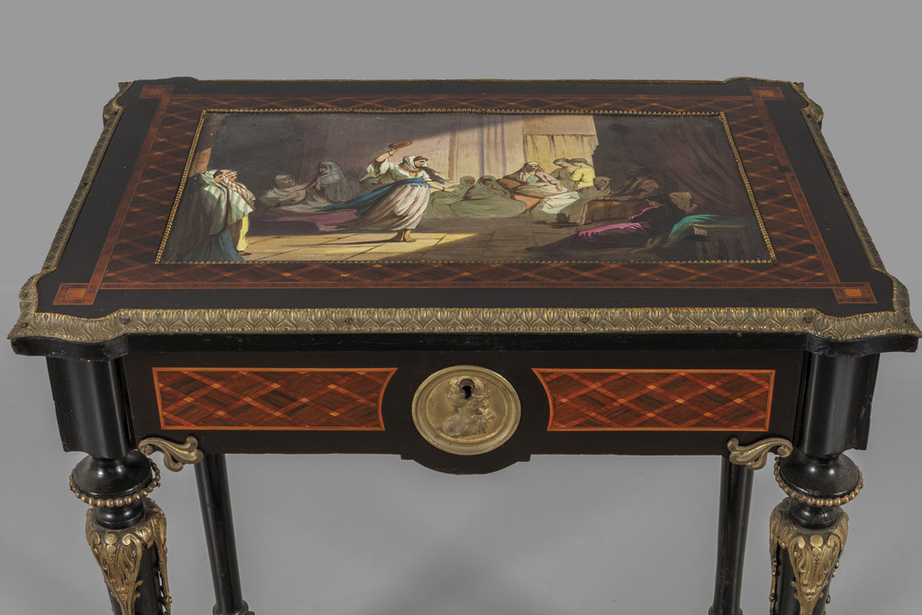 Tavolino Napoleone III da lavoro finemente intarsiato piano decorato da grande placca in porcellana policroma raffigurante odalische ricca decorazione in bronzi dorati Francia fine sec.XIX