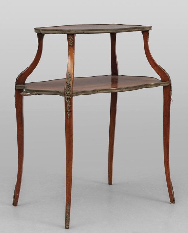 Etagere da centro a due piani lastronata in palissandro ricca decorazione in bronzo con maniglie laterali Francia sec.XX
