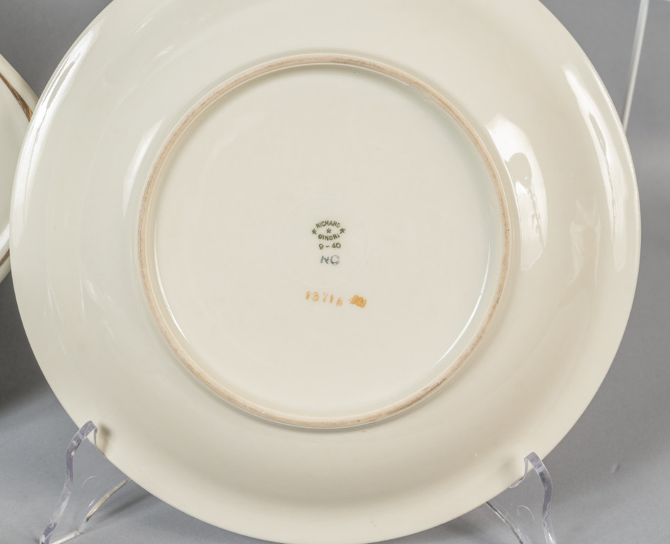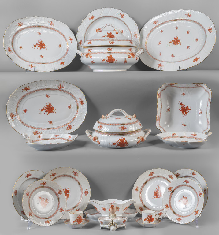 Servizio di piatti in porcellana di Herend decorato in policromia con fiori arancioni su fondo bianco composto da 24 piatti piani 12 fondi 12 frutta 1 zuppiera 1 legumiera 1 insalatiera 1 salsiera 2 raviere 1 saliera 1 piatto da portata rotondo e 3 ovali 12 tazzine da caffè con piattini