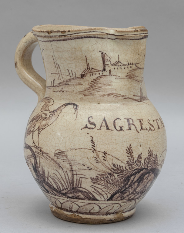 Versatoio in maiolica decorato a fondo manganese con paesaggi e volatili marcato Sagrestane 1771