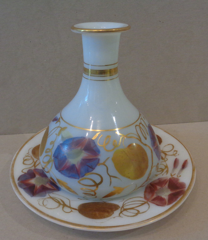Bottiglia e piattino in vetro lattimo decorato a fiori in policromia ed oro sec.XIX