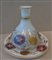 Bottiglia e piattino in vetro lattimo decorato a fiori in policromia ed oro sec.XIX