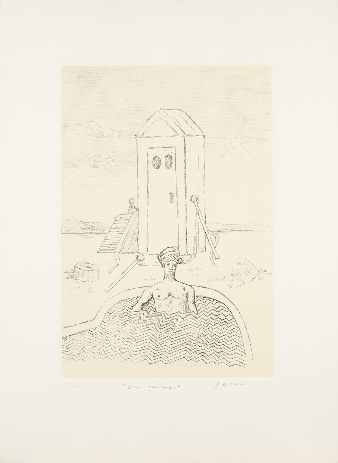 DE CHIRICO GIORGIO (1888 - 1978). Bagni pomeridiani.. 59/70. Tiratura, firma e titolo in basso a matita. Timbro a secco Giorgio De Chirico in basso a sinistra, timbro a secco Alberto Caprini Stampatore, Roma. Dimensione lastra: 47x32 cm. Edizioni Bora snc. Edizione totale: 70 esemplari numerati da 1 a 70; 25 esemplari numerati da I a XXV + 12 p.d.a. Pubblicazione: Giorgio De Chirico catalogo dell'opera grafica 1969 - 1977, Edizioni Bora, pag. 32. Cm 50,50 x 70,00.