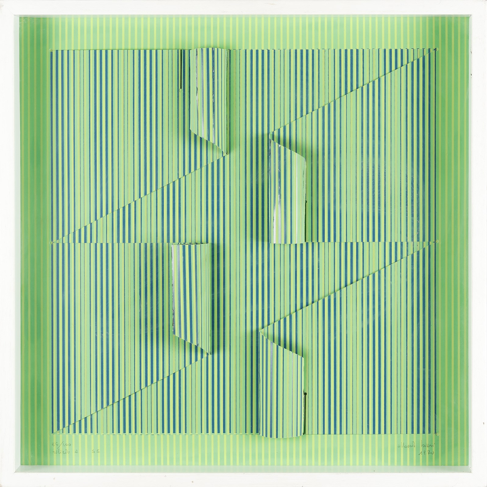 BIASI ALBERTO (n. 1937). Progetto S5, rilievo 4 in blu e giallo su fondo verde.. 56/100. Tiratura, titolo, firma e anno a matita in basso. Cartoncino superiore fustellato a zig zag con tagli corti verticali per l'incastro. Giuseppe Strano Editore, Padova.. Cm 46,00 x 46,00.