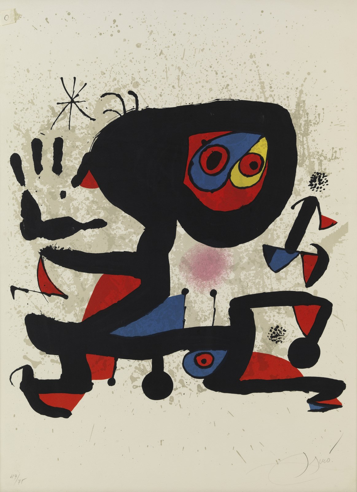 MIRO' JOAN (1893 - 1983). Unesco - Droits de l'homme.. 49/75. Tiratura e firma in basso a matita. Opera a sostegno della campagna per i diritti umani dell'UNESCO. Edizione totale: 75 copie su carta pergamena Arches firmate e numerate + 5500. Editore: Unesco, Parigi. Stampa: Arte Adrien Maeght, Parigi. Pubblicazione: Catalogo della mostra «Joan Miró. Obra gráfica ». Sala d’Esposizioni della Caixa d’Estalvis Laietana, Mataré (Barcellona), 1978, n. 37. ""Art News"", New York, Yol. 79, n. 3, marzo 1980, p. 113. . Cm 60,00 x 80,00. 1974