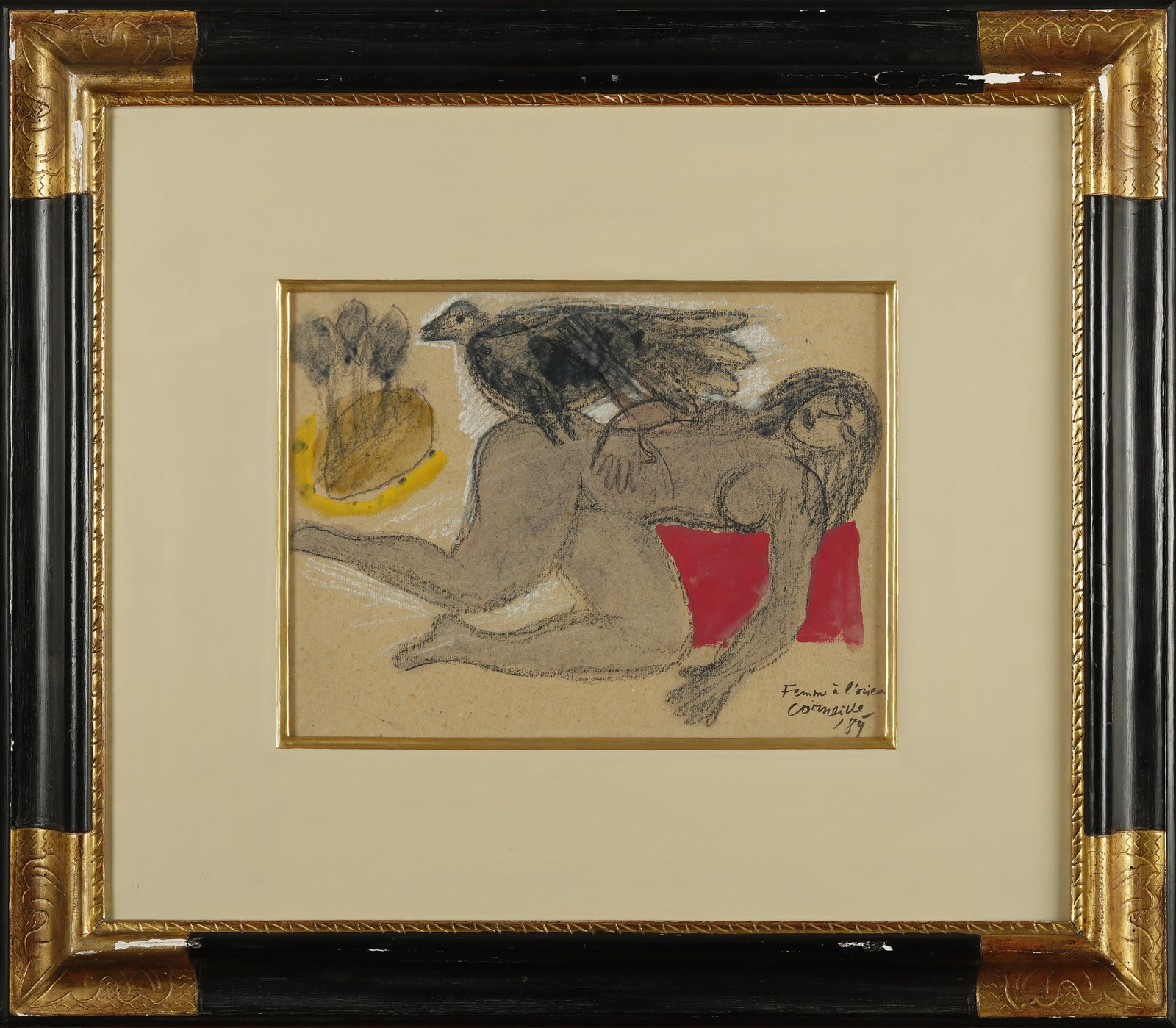 CORNEILLE (1922 - 2010). Femme à l'oiseau.. Titolo, firma e anno in basso a destra. Opera archiviata presso la Fondation Guillaume Corneille come da documentazione fotografica allegata all'opera. Piccoli difetti.. Cm 32,00 x 24,00. 1989