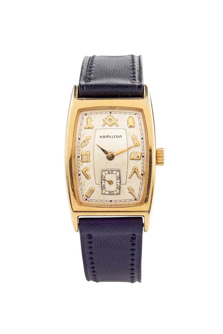 Cassa di forma, placcata, con fondello in acciaio; quadrante argento con simboli massonici applicati
