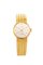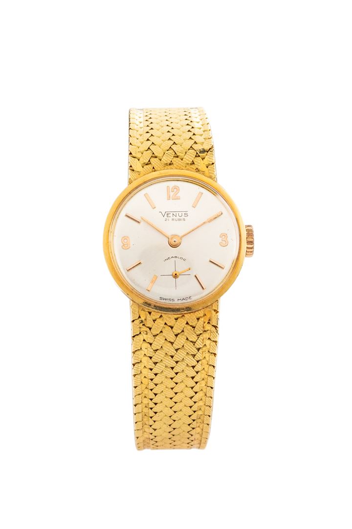 Cassa in oro giallo con bracciale integrato lavorato a tessuto; quadrante soleil con numeri arabi applicati ai quarti ed indici geometrici