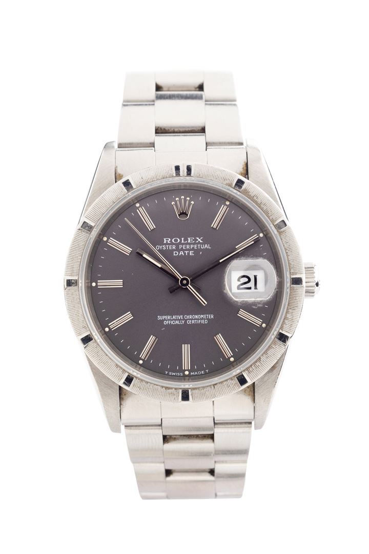 Cassa in acciaio con fondello e corona a vite. Quadrante grigio con finitura soleil, secondi centrali, indici geometrici applicati e datario al 3. Bracciale integrato modello “Oyster” con chiusura clasp in acciaio.
