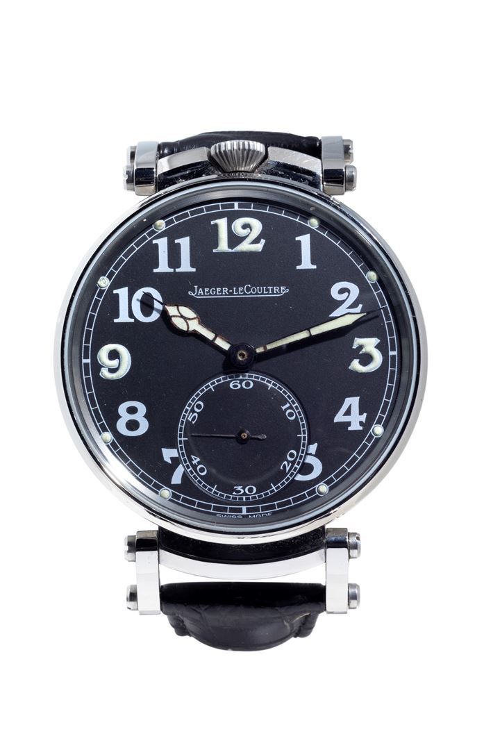 Orologio da tasca, riadattato a polso, con cassa in acciaio, anse basculanti; quadrante nero finitura matte, numeri arabi serigrafati e ai quarti luminescenti. Minuteria a binario; indicazione secondi continui al 6. Fondello in vetro.