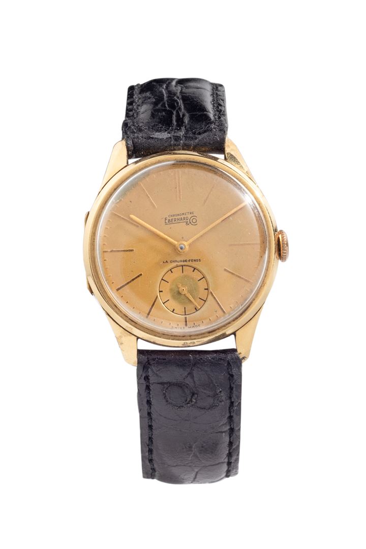 Cassa a cerniera, in oro giallo; quadrante champagne con indici geometrici applicati; secondi al 6
