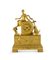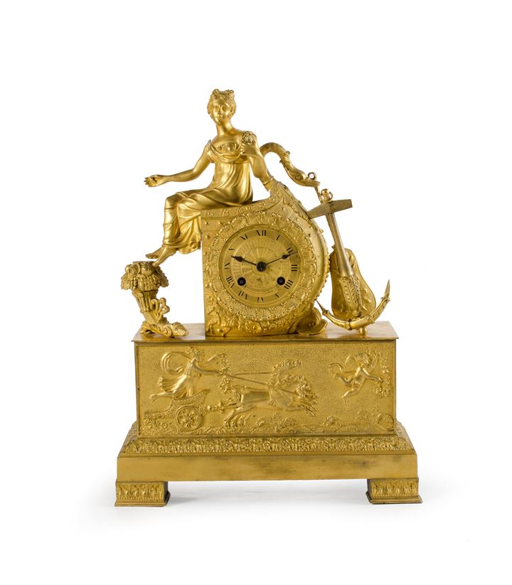 in bronzo dorato (difetti), XIX secolo. Parte superiore con figura femminile allegorica seduta su di un carro finemente ornato; decori con strumenti musicali, cornucopia e un'ancora. Parte inferiore di forma rettangolare con rilievo raffigurante una donna su di una biga. Quadrante in bronzo dorato con numeri serigrafati. Da revisionare.