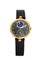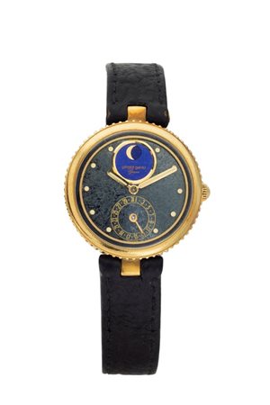 Cassa in oro giallo con particolare decoro dentato; quadrante cangiante con indici luminescenti; contatore fasi luna al 12, data al 6. Bracciale con chiusura clasp