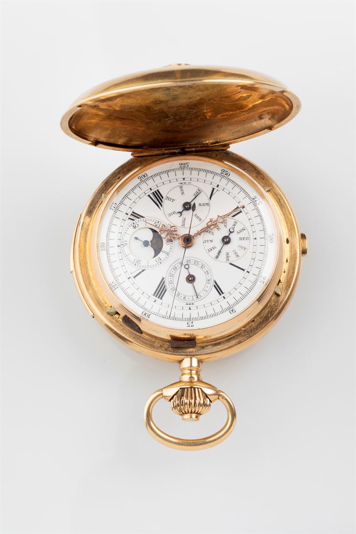 Orologio da tasca, calendario completo e fasi luna, suoneria ore/quarti, 1890-1900 ca