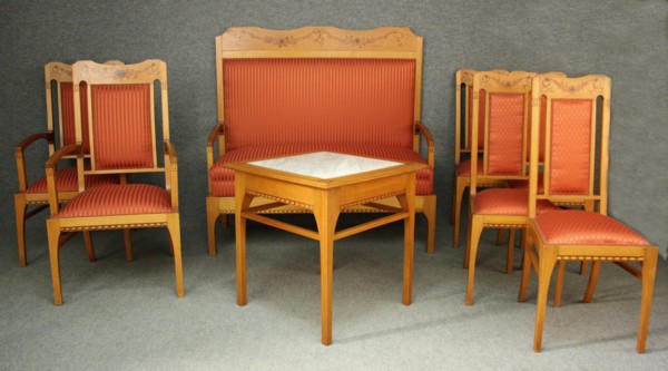 Firmato. Salotto composto da un divano, due poltrone, quattro sedie e un tavolino in legno fimente intarsiato con motivi a ghirlande. Periodo Liberty. Ottime condizioni.
