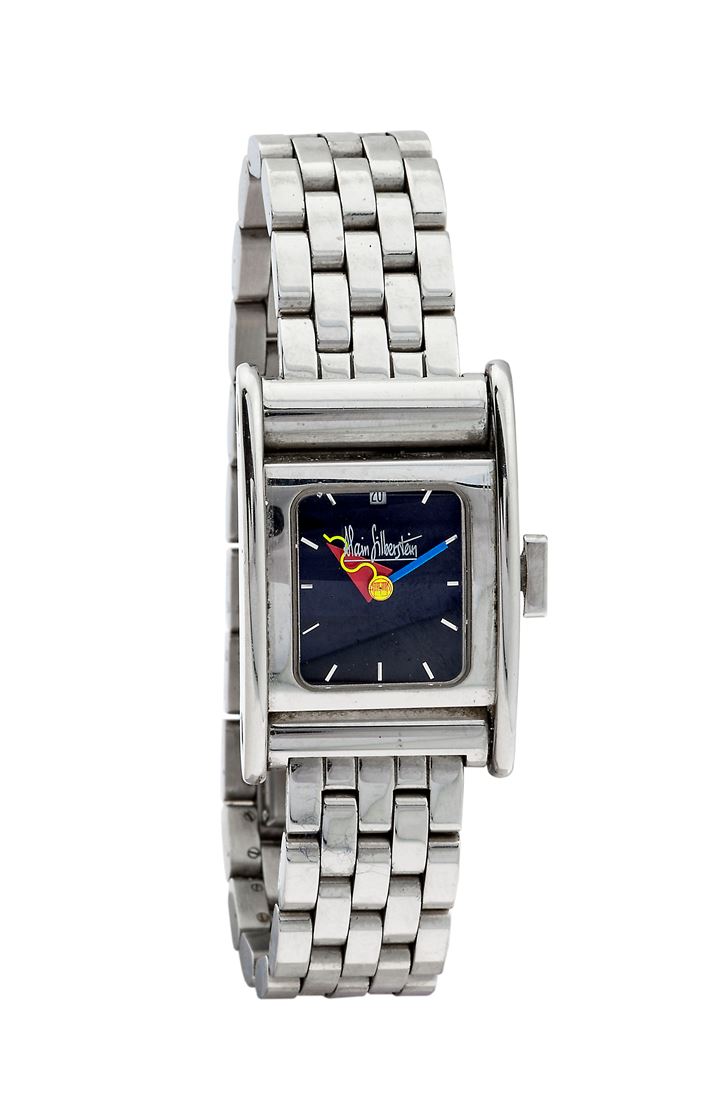 Orologio di design con cassa in acciaio, corona di carica triangolare, quadrante nero con indici applicati e lancette geometriche colorate.