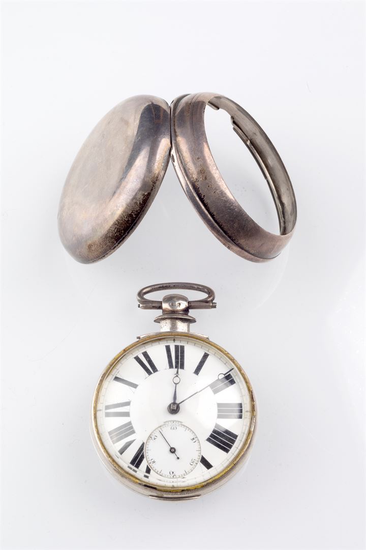 Doppia cassa in argento; quadrante in smalto bianco con numeri romani, lancetta secondi al 6 (filature)
