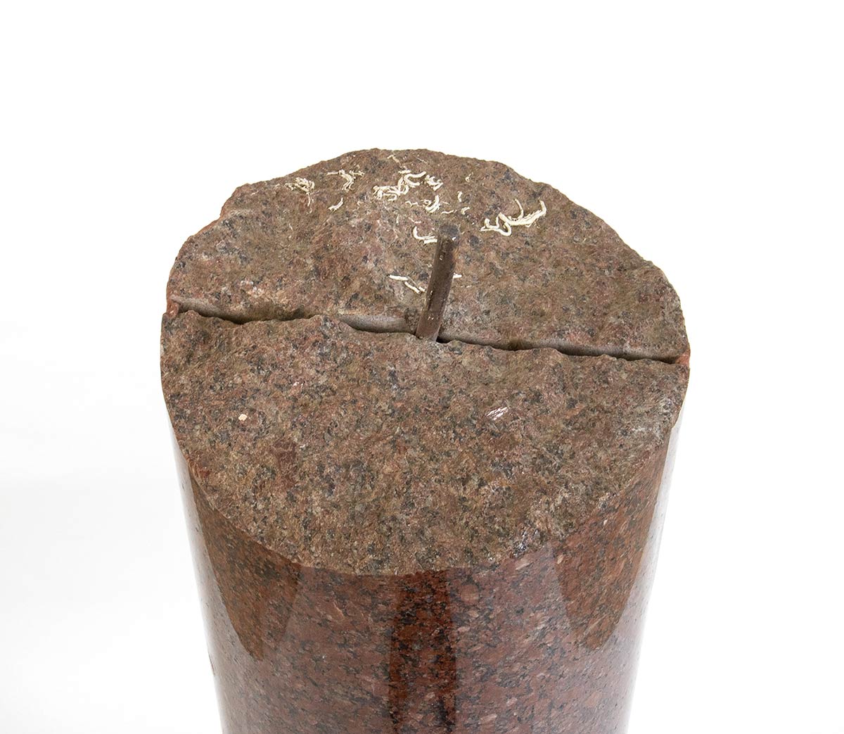 La colonna in granito rosso egiziano è rilavorata in tempi recenti, ma presenta incrostazioni marine sulla superficie della vecchia linea di frattura.