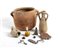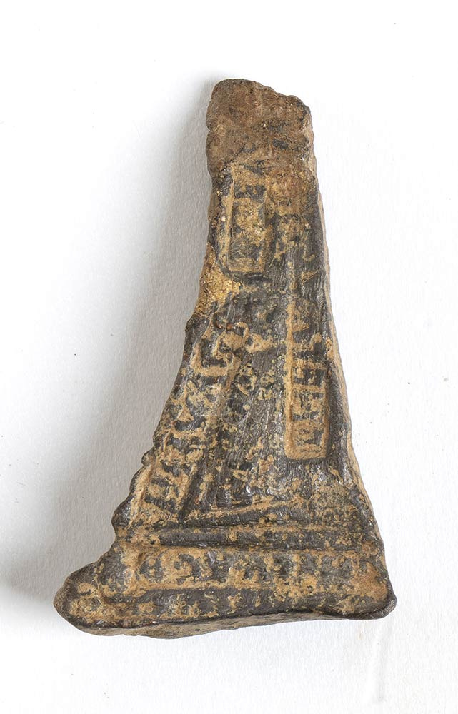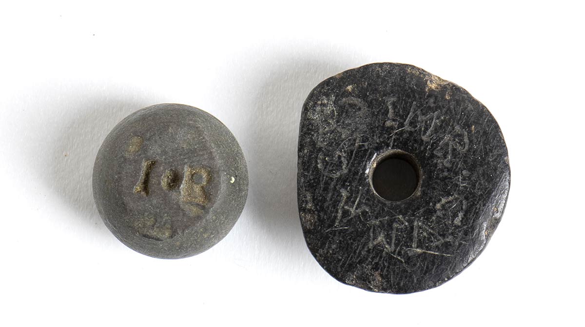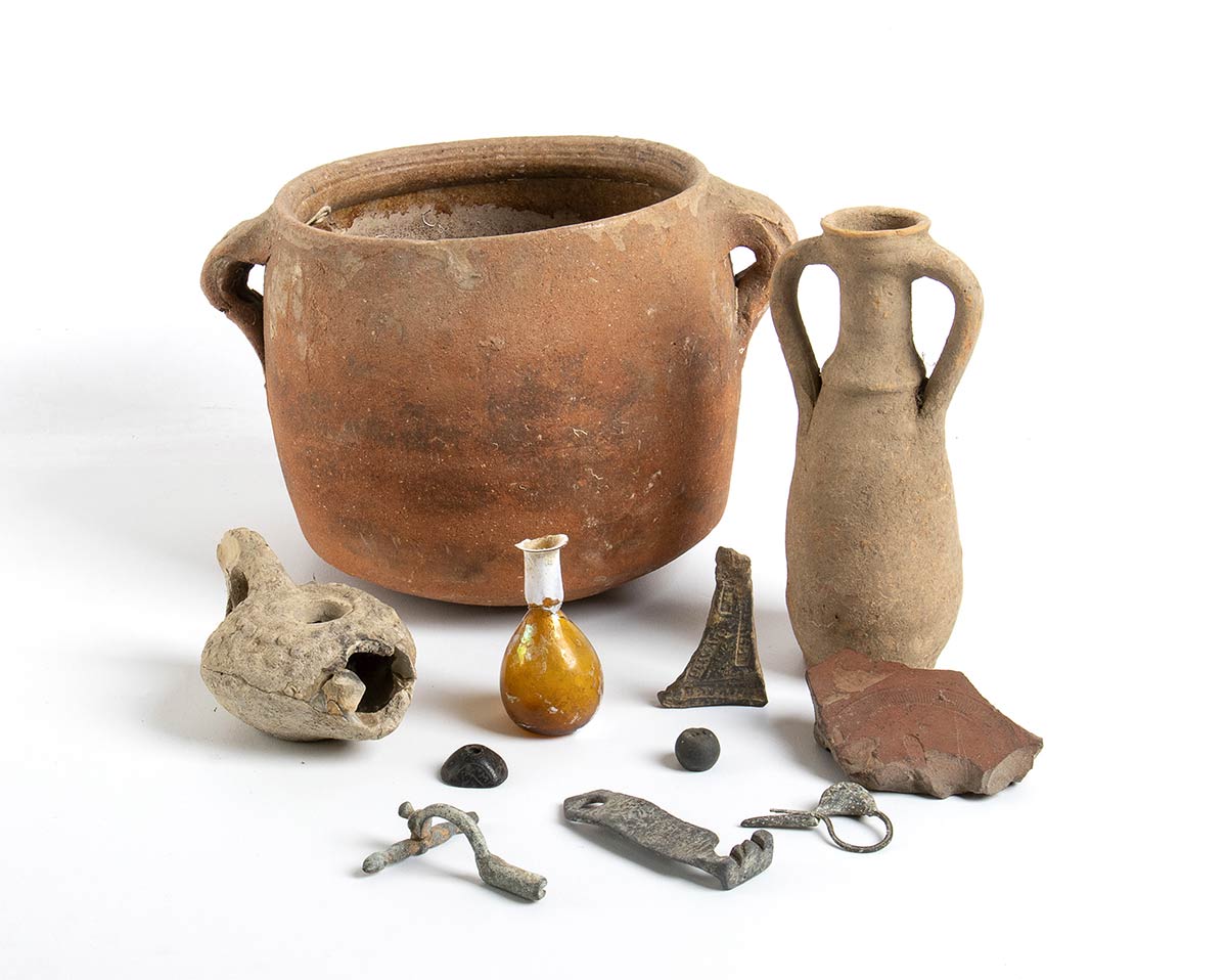 Gruppo composto da una interessante grappa in piombo recante bolli ed iscrizioni varie; un peso da gioielliere, due fibule ed una chiave in bronzo; un vago in onice con iscrizione latina graffita; un unguentario in vetro e un bollo in planta pedis in sigillata aretina; una lucerna con decorazione a globetti, una bottiglia tardo antica e una pentola rinascimentale.
