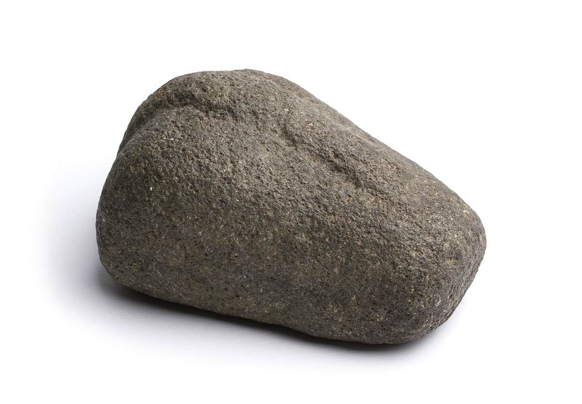 Peso in basalto grigio scolpito in forma di anatra dormiente stilizzata con testa e lungo becco resi in rilievo e ripiegati sul corpo.