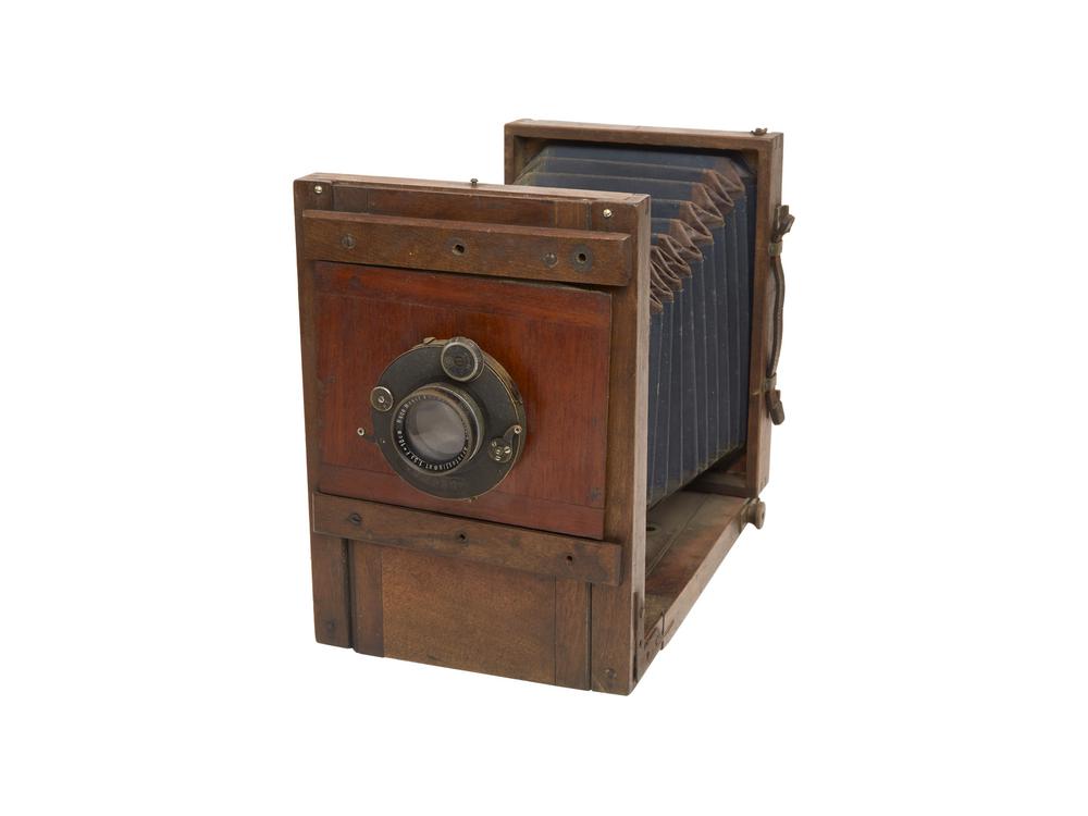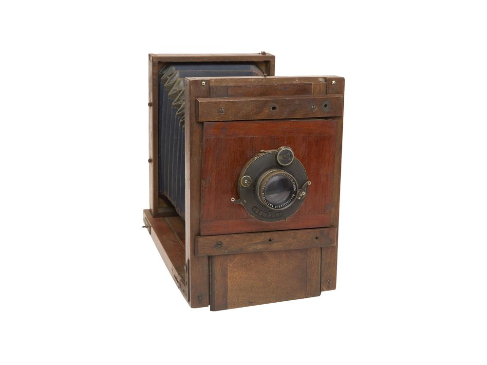 Banco ottico pieghevole in legno formato 13x18 cm. Meccanismi in ottone. Completo di vetro smerigliato di messa a fuoco e ottica Hugo Meyer Aristostigmat 18 cm f. 5.5 con matricola n°618074 e otturatore Compur. Le parti in legno e il soffietto sono usurati. Con comprensibili segni d'uso dovuti all'età.
