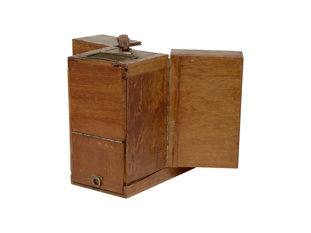 A magic lantern with a wooden box. Complete with "Winged Victory" in metal which has the function of supporting the optics. In a good condition. With some signs of use giving the age. Not tested. Possible malfunctions and/or missing parts.
