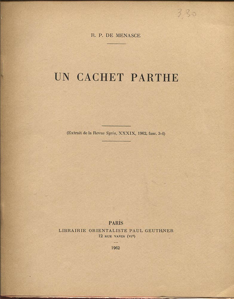 DE MENASCE R.P. - Un cachet parthe. Paris, 1962. Pp. 225 – 230, ill. nel testo. Ril ed buono stato.