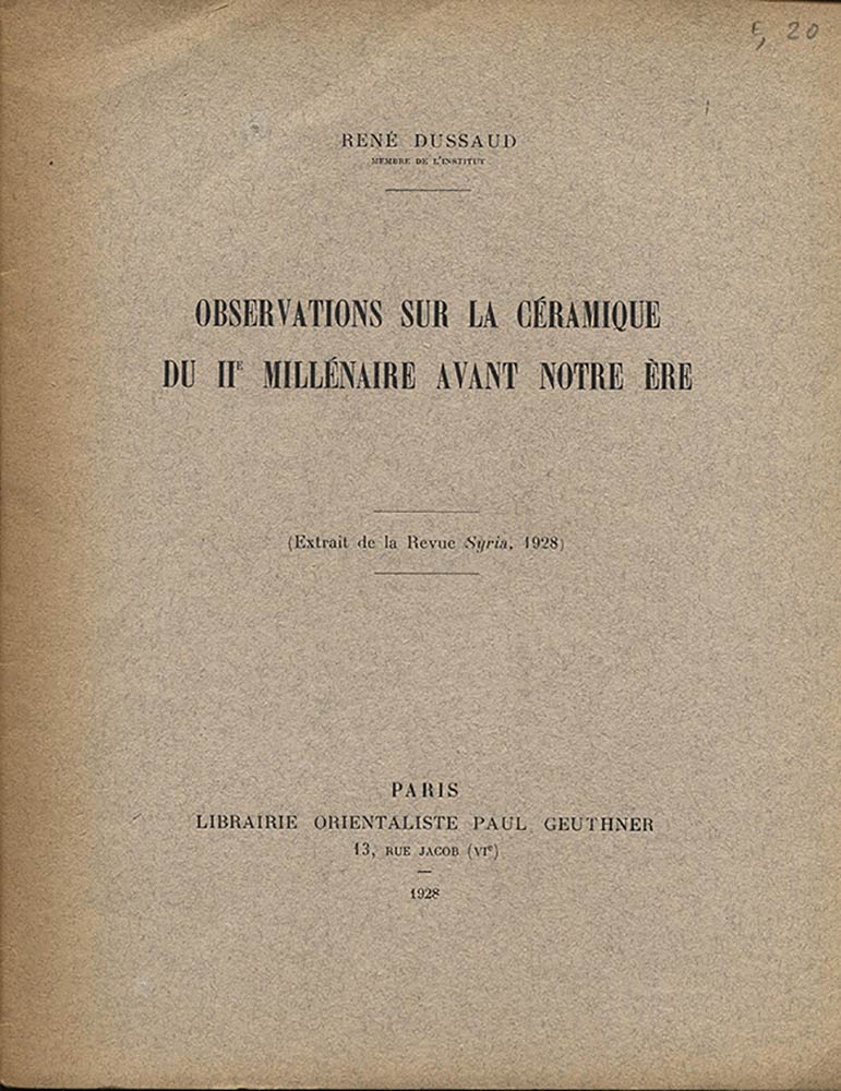 DUSSAUD R. - Oservation sur la ceramique du II millenaire avant notre ere. Paris, 1928. Pp. 131 – 150, ill. nel testo. Ril ed. Buono stato, importante.