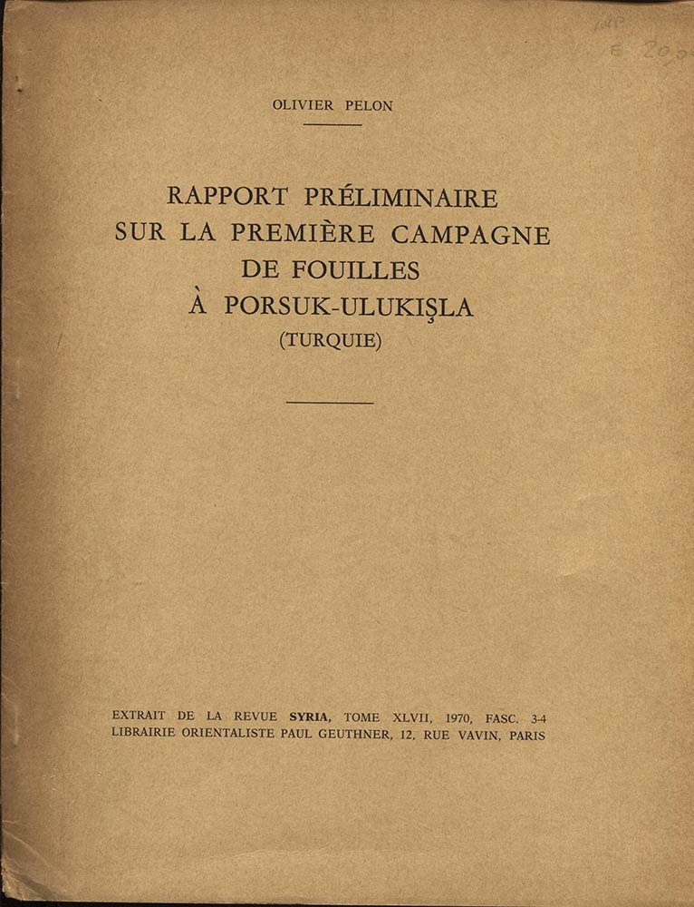 PELON O. – Rapport preliminare sur la premiere campagne de fouilles a Porsuk-Ulukisla ( Turquie). Paris, 1970. Pp. 279, - 286, tavv. 1 + ill. nel testo. ril. ed. buono stato.