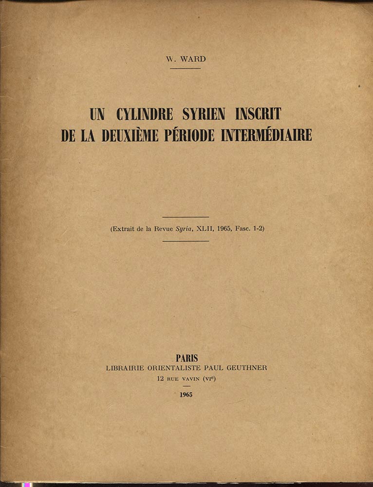 WARD W. – Un cylindre syrien inscrit de la deuxieme periode intermediaire. Paris, 1965. Pp. 35 – 44, tavv. 1 + ill. nel testo. ril. ed. buono stato.