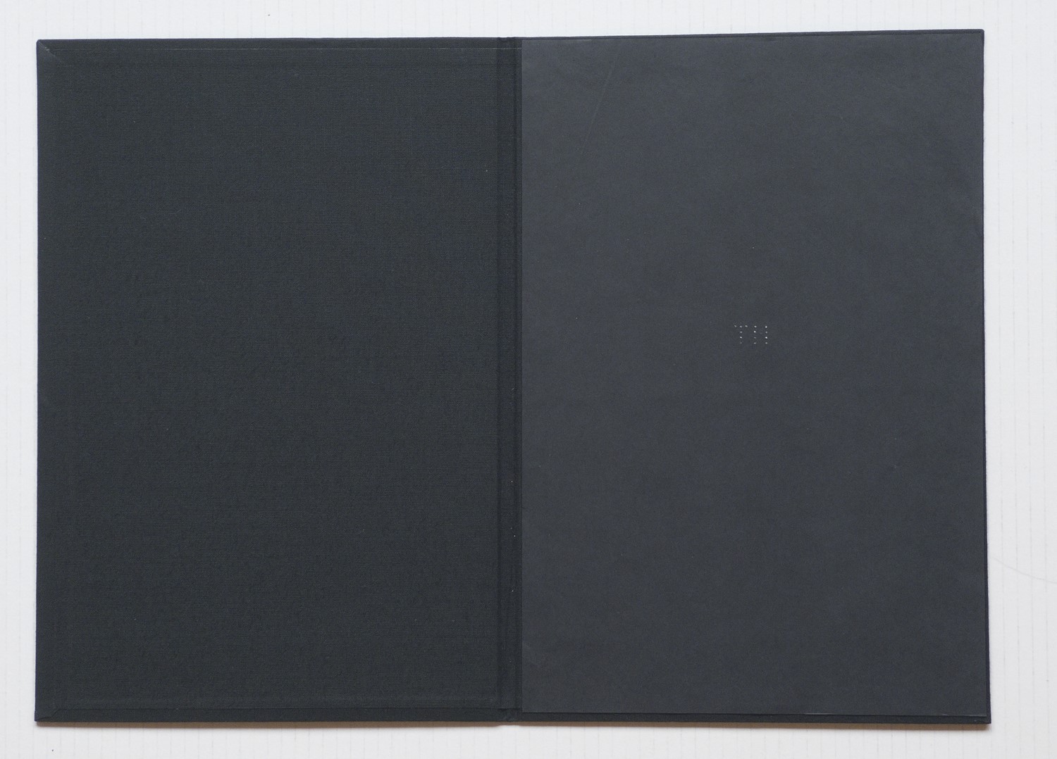 Libro d’artista costituito da un foglio di carta velina nera, punzonato manualmente al centro, custodito in una cartella cartonata in tela nera con impresso a secco il colophon.