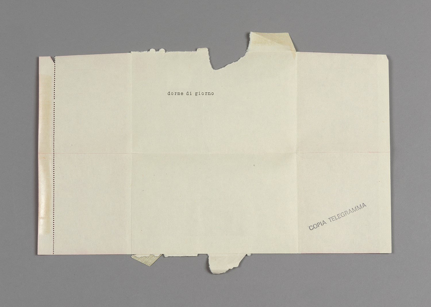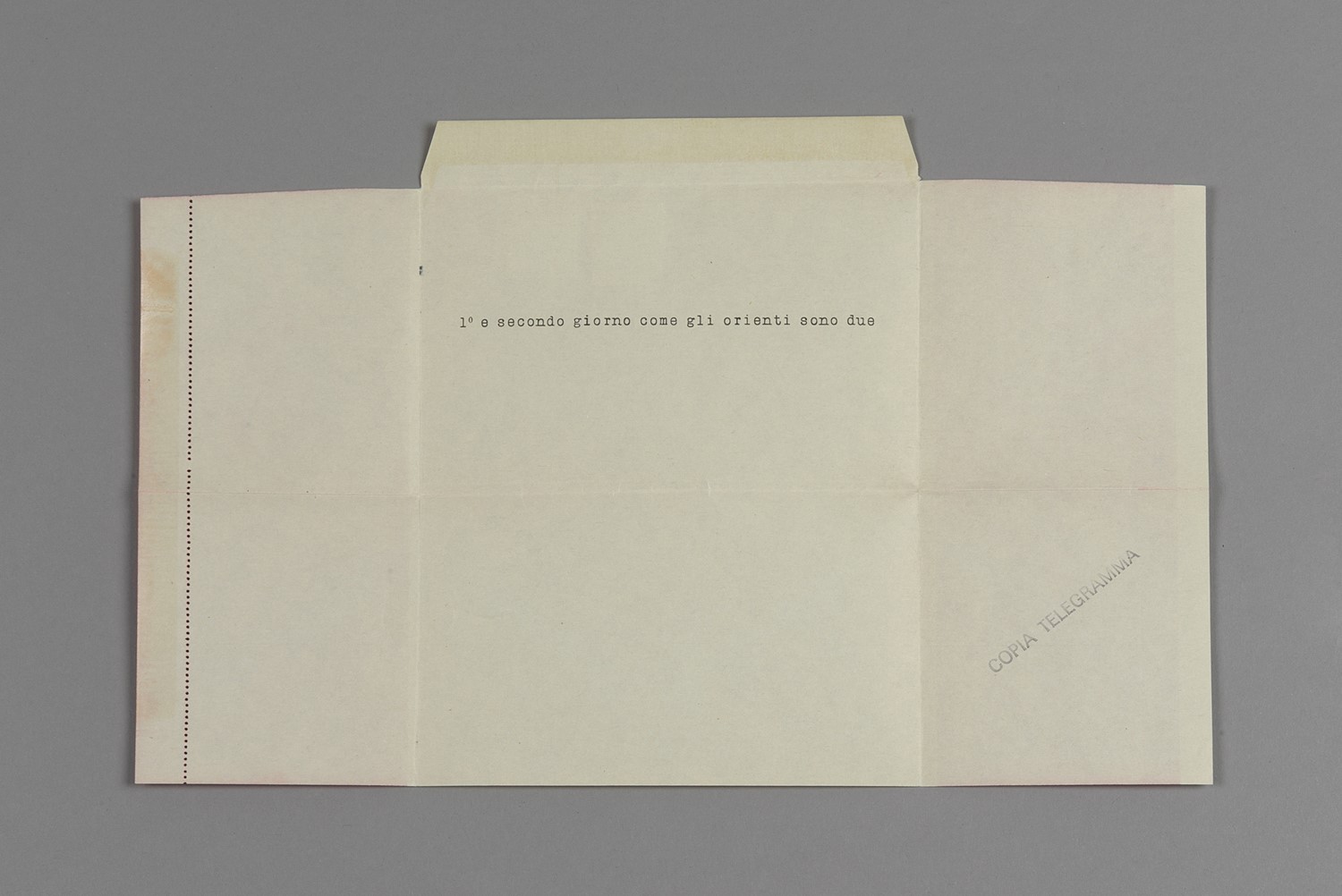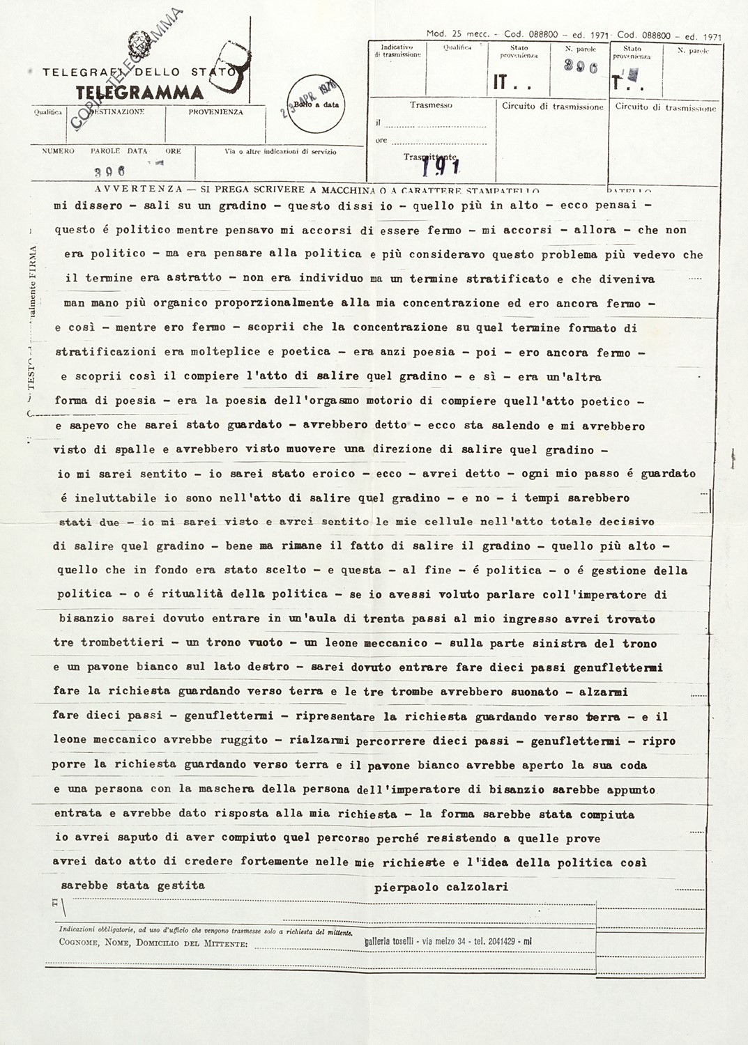 Pier Paolo Calzolari ha realizzato nell’aprile del 1976 il seguente lavoro. Per 9 giorni ha spedito un telegramma al giorno a 15 persone. Copie di questi 8 telegrammi, più copia dell’orario ferroviario, sono state spedite contemporaneamente ad altre 200 persone. L’orario ferroviario è stato inviato a tutte le persone dopo il primo telegramma: una tabella ufficiale relativa alla linea Milano – Nocera Inferiore con alcuni lavori di transito segnati a matita. L’ultimo telegramma è stato spedito solo ai due destinatari, Marco Bagnoli e Jannis Kounellis. Il giorno 5 maggio è partito da Milano al mattino diretto a Nocera Inferiore, provincia di Salerno, un convoglio ferroviario con un vagone interamente riservato e pertanto completamente vuoto.