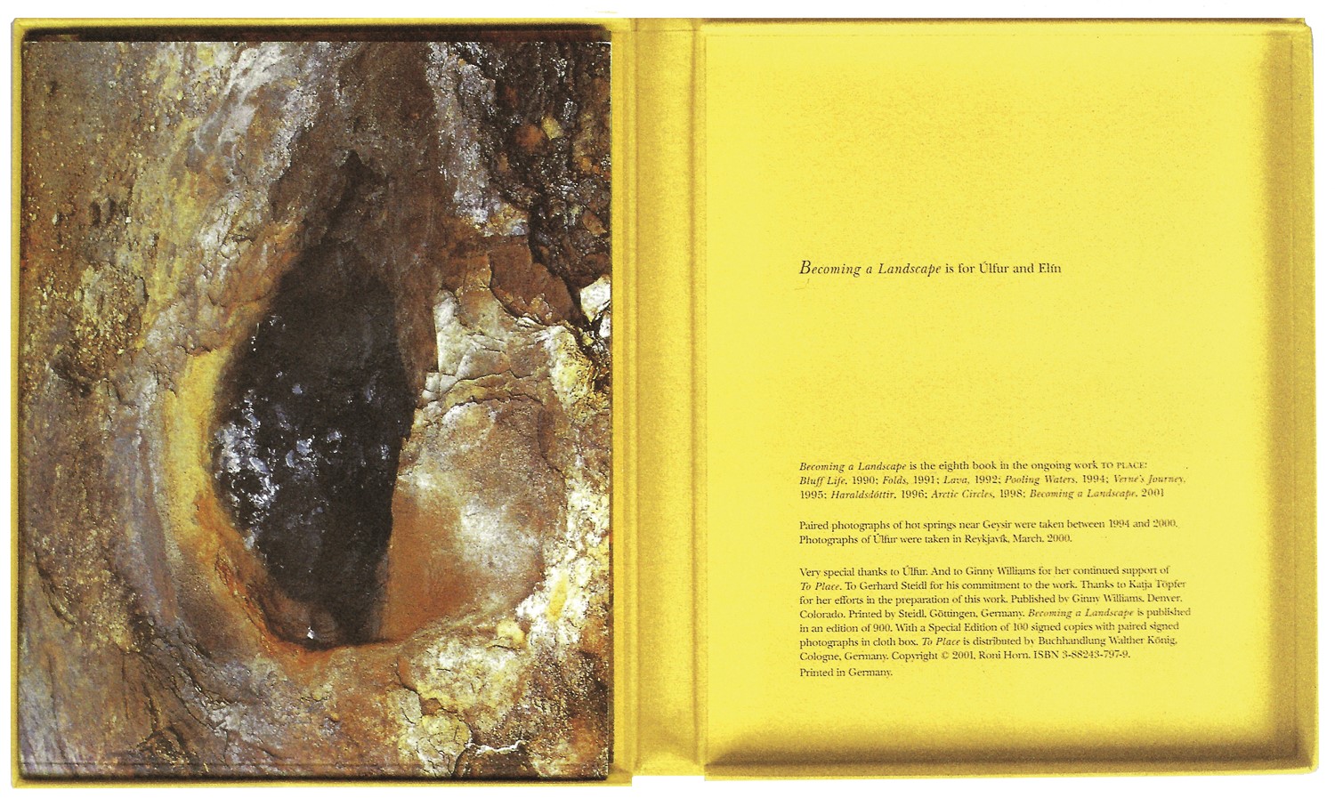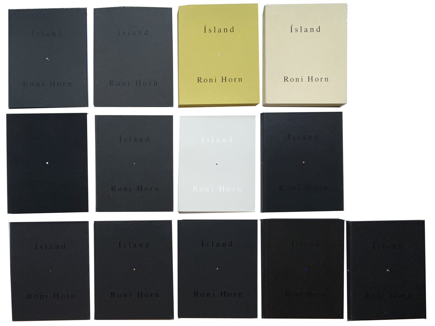 Opera interamente illustrata con disegni e fotografie realizzati appositamente da Roni Horn. Descrizione dei volumi: 1) Island. To Piace. Bluff Life, New York, Peter Blum Edition, 1990; legatura rivestita in tela color grigio antracite, 26x22 cm, pp. 36, graphic design a cura di Roni Horn e Klaus Baumgärtner, tiratura di 1.150 copie. 2) lsland. To Piace. Folds, New York, Mary Boone Gallery, 1991;legatura rivestita in tela color grigio antracite, 26x22 cm, pp. 72, graphic design a cura di Roni Horn e Andrew Mc Call Associates, tiratura di 700 /750 copie. 3) Island. To Piace. Lava, New York, Roni Horn, 1992; legatura rivestita in tela color grigio antracite, 26x22 cm, pp. 96, graphic design a cura di Roni Horn e Andrew Mc Call Associates, tiratura di 750 copie. 4a) (volume I) lsland. To Piace. Pooling Waters (illustrazioni), Köln, Walther Kõnig, 1994; legatura rivestita in tela color grigio antracite, 26x22 cm, pp. 96, tiratura di 1.000 copie. 4b) (volume II) lsland. To Piace. Pooling Waters (testo), Köln, Walther Kõnig, 1994; legatura in tela color grigio antracite, 26x22 cm, pp. 176, tiratura di 1.000 copie. 5) lsland. To Piace. Verne’s Journey, Köln, Walther Kõnig, 1995; legatura rivestita in tela color grigio antracite, 26x22 cm, pp. 56, tiratura di 1.000 copie. 6) lsland. To Piace. Haraldsdòtfir, Denver, Ginny Williams, 1996; legatura rivestita in tela color grigio antracite, 26x22 cm, pp. 96, tiratura di 1.100 copie. 7) lsland. To Piace. Arctic Circles, Denver, Ginny Williams, 1998; legatura rivestita in tela color grigio antracite, 26x22 cm, pp. 136, tiratura di 1.650 copie. 8) lsland. To Piace. Becoming a Landscape, Denver / Köln, Ginny Williams / Walther König, 2001; 26x22 cm, custodia rivestita in tela color giallo mais contenente 2 tomi in brossura. Tomo I: pp. 48, Tomo II: pp. 48, tiratura di 900 copie. 8) lsland. To Piace. Becoming a Landscape, Denver / Köln, Ginny Williams / Walther König, 2001; 26x22 cm, custodia rivestita in tela color carnicino, contenente 2 tomi in brossura. Tomo I: pp. 48, Tomo II: pp. 48. Edizione speciale nella tiratura limitata di 100 copie firmate da Roni Horn con 2 fotografie firmate dall’artista. 9) lsland. To Piace. Doubt Box, Gölttingen, Steidl Verlag, 2006; custodia rivestita in tela nera, 26x22 cm, 28 tavole sciolte in cartoncino, tiratura di 1.000 copie. 10) lsland. To Piace. Haraldsdòttir, Part Two, Gölttingen, Steidl Verlag, 2011; legatura rivestita in tela color grigio antracite, 26x22 cm, pp. 144, tiratura di 1.000 copie. Allegato: Island. To place. Inner Geography, East Greenwich, Meridian Printing Company, 1994; brossura cartonata, pp. 32, catalogo della mostra interamente illustrato a colori con testi di Alex Castro e Jan Howard. Questo volume è erroneamente considerato un supplemento del terzo volume. Tiratura di 2.000 copie. [Bibliografia: Philippe Aarons – Andrew Roth, In Numbers. Serial Publications by Artsts Since 1955, s.l., PPP Editions, 2009: pp. 388-393; Andrea Joostens - Petra Roettig, Kunstlerbucher / Artists’ books. Die Sammlung / The Collection, Hamburg, Hamburger Kunsthalle, 2018: pp. 66-67; Martin Arr - Gerry Badger, The Photobook. A History, London, Phaidon, 2006-2008, 2 volumi: volume II, pp. 164-165; Andrew Roth, The Open Book. A history of the photographic book from 1878 to the present, Götheborg, Hasselblad Center, 2004: pp. 348-351].