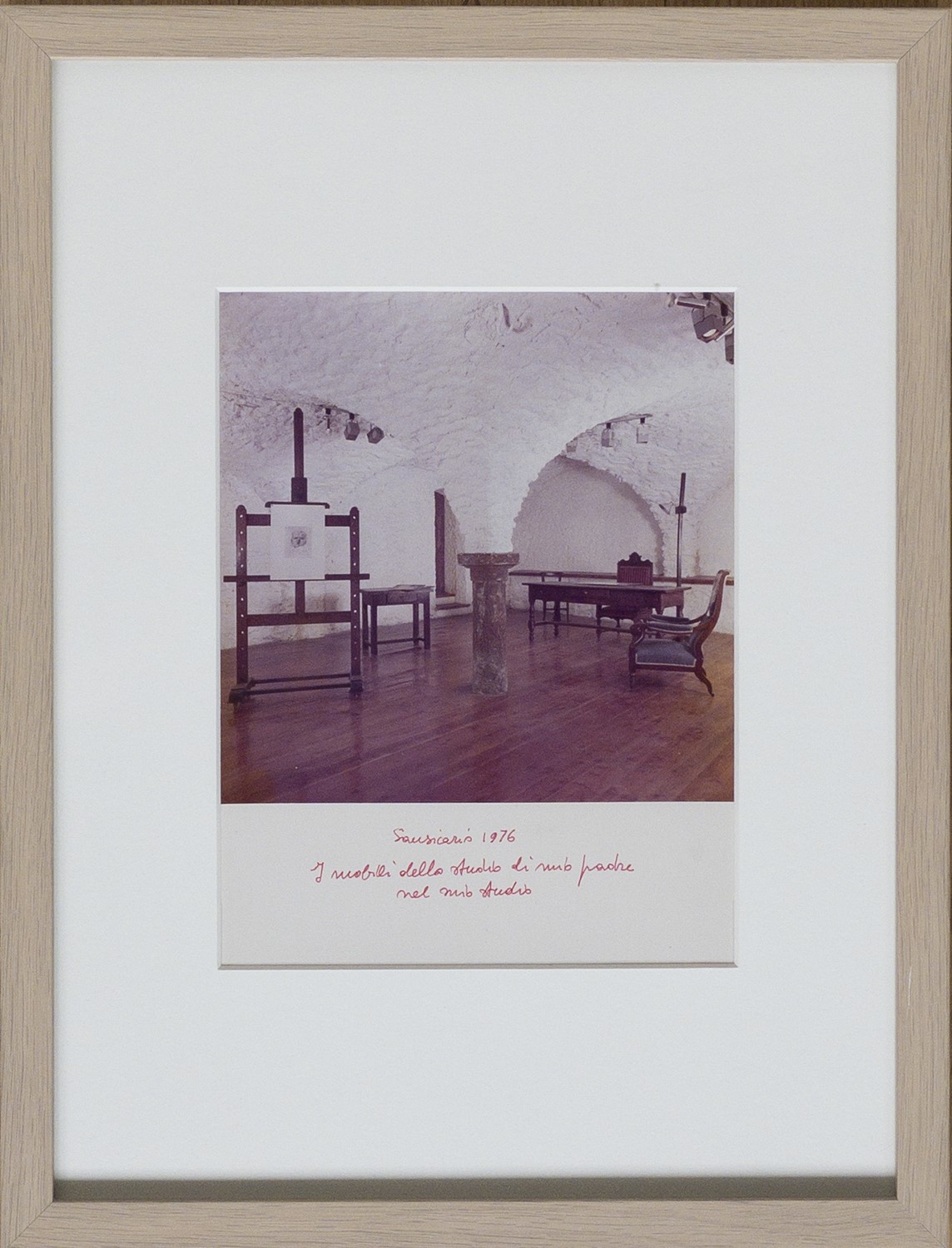 Fotografica originale a colori di un’installazione realizzata dall’artista nel suo studio di Sansicario nel 1976 in cui furono esposti i mobili del padre, nell’immagine compare il celebre ritratto dell’artista bambino disegnato dal padre appoggiato sopra un cavalletto: “(…) Nel 1976 Pistoletto presenterà come installazione nel suo studio di San Sicario I mobili dello studio di mio padre nel mio studio...” ( www.pistoletto.it/it/crono04.htm). Nota a pennarello rosso autografa dell’artista. Tiratura non indicata.